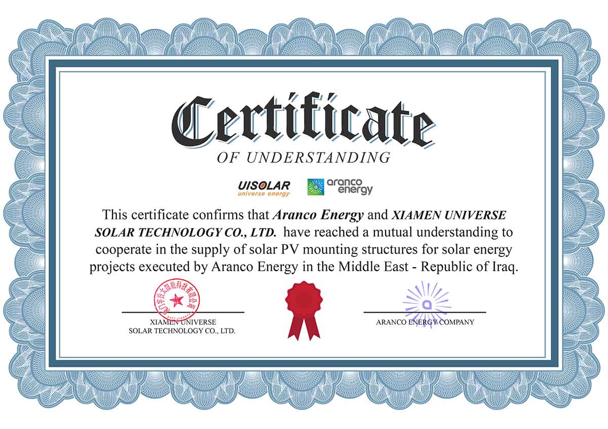 Xiamen Universe Solar Technology Company signed a strategic partnership with Aranco Energy , Iraq. This includes providing and supplying varient solar mounting structures for the commercial projects across Middle East and the Republic of Iraq. Aranco is a leading energy provider in the region, focusing on providing ultimate solutions in electrical and renewable energy fields for the project across Kurdistan and Iraq.